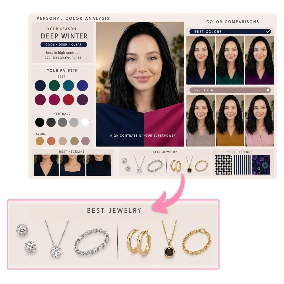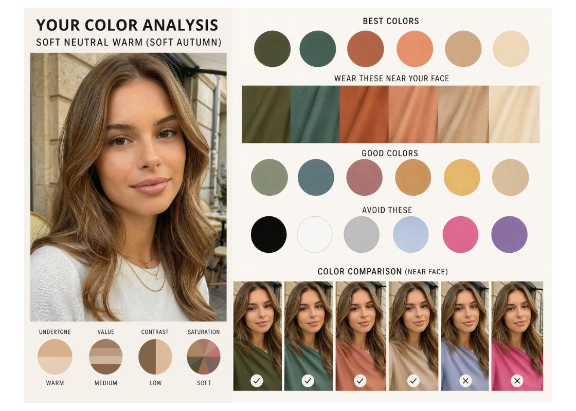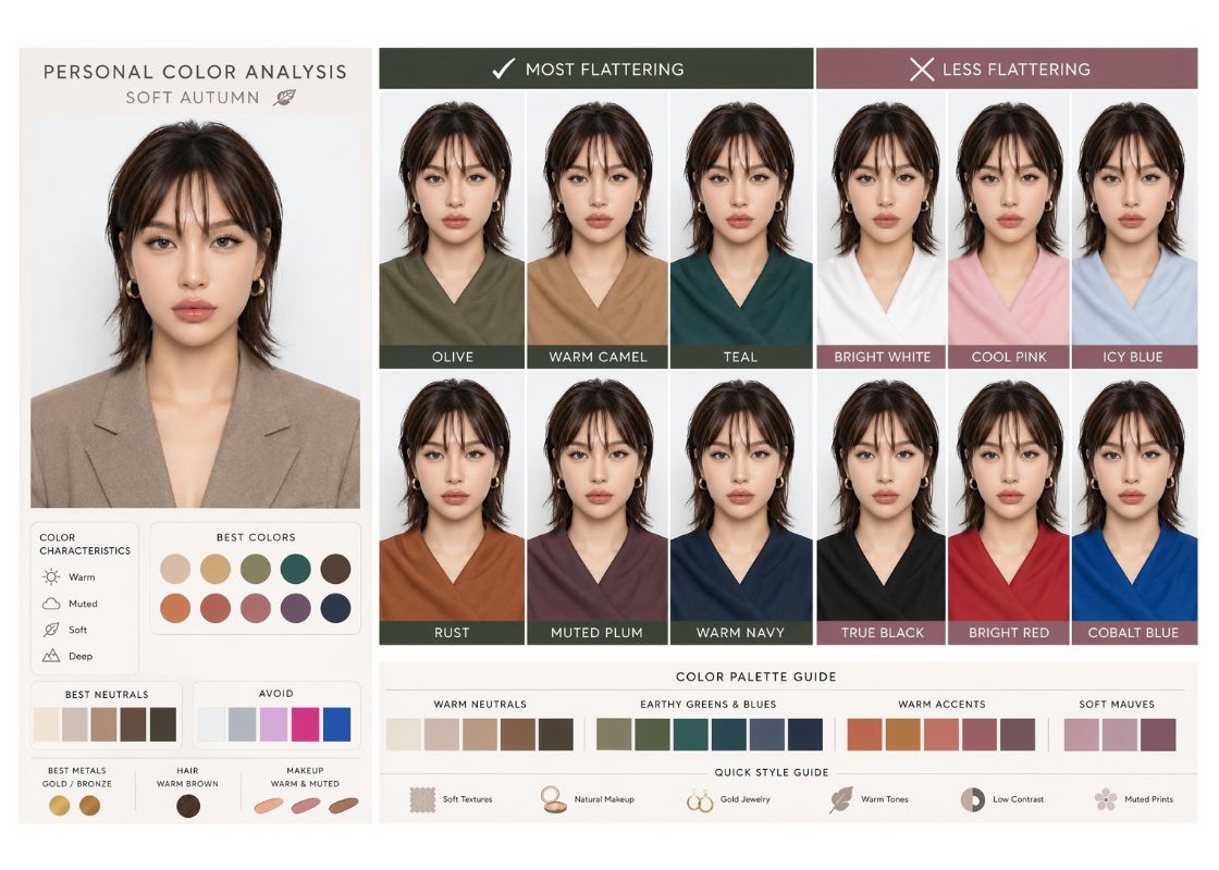 Analisis warna adalah metode untuk mengidentifikasi warna yang harmonis dengan fitur wajah. Mengetahui personal color palette membantu Anda memilih pakaian yang membuat Anda tampak cerah.